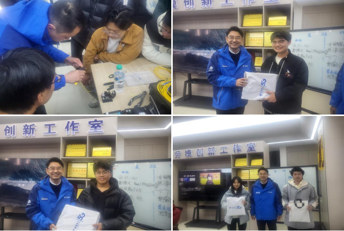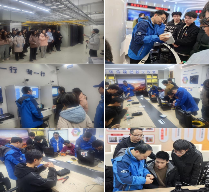 同学们还分组参观了电信生产机房,了解运维流程,观察设备运行情况。另外,在企业导师指导下,同学们还操作了AI 云电脑,参与网线制作、光纤熔接实践,不少同学迅速掌握技巧,获得电信指导老师的肯定与鼓励。