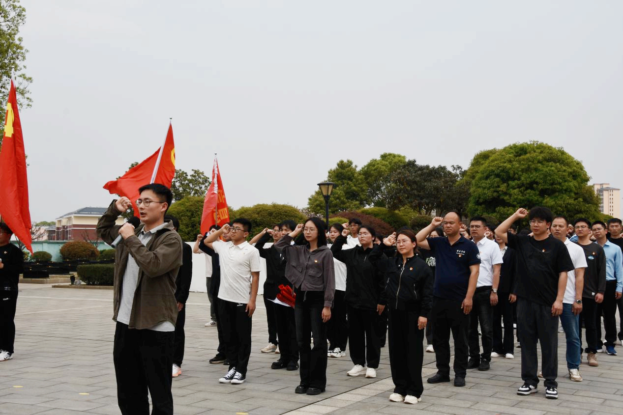 烈士纪念碑前松柏苍翠,师生列队肃立,齐唱国歌。随后,全场垂首默哀三分钟,缅怀革命先辈。默哀后,全体师生党员面向党旗,高举右拳重温入党誓词,“为共产主义奋斗终身”的誓言在烈士陵园上空回荡,擦亮党员政治本色。