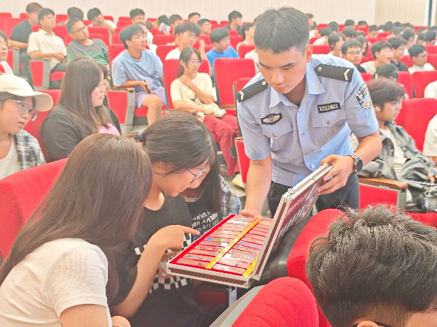 讲座中,民警以真实案例切入,剖析电信网络诈骗“境外操控、精准作案、集团运作”新特点,用“人物身份不明+非见面沟通+要求转账汇款=诈骗”的“反诈公式”帮助学生快速识骗,并强调不泄露敏感信息、及时核实可疑信息、遇骗立即报警止付三大要点。同时结合林则徐虎门销烟历史,阐明禁毒紧迫性,通过展示毒品仿真模型及图文资料,详解“麻古”“K粉”及伪装成“奶茶”的新型毒品特征与危害,提醒学生警惕陌生人提供的食品饮料。
