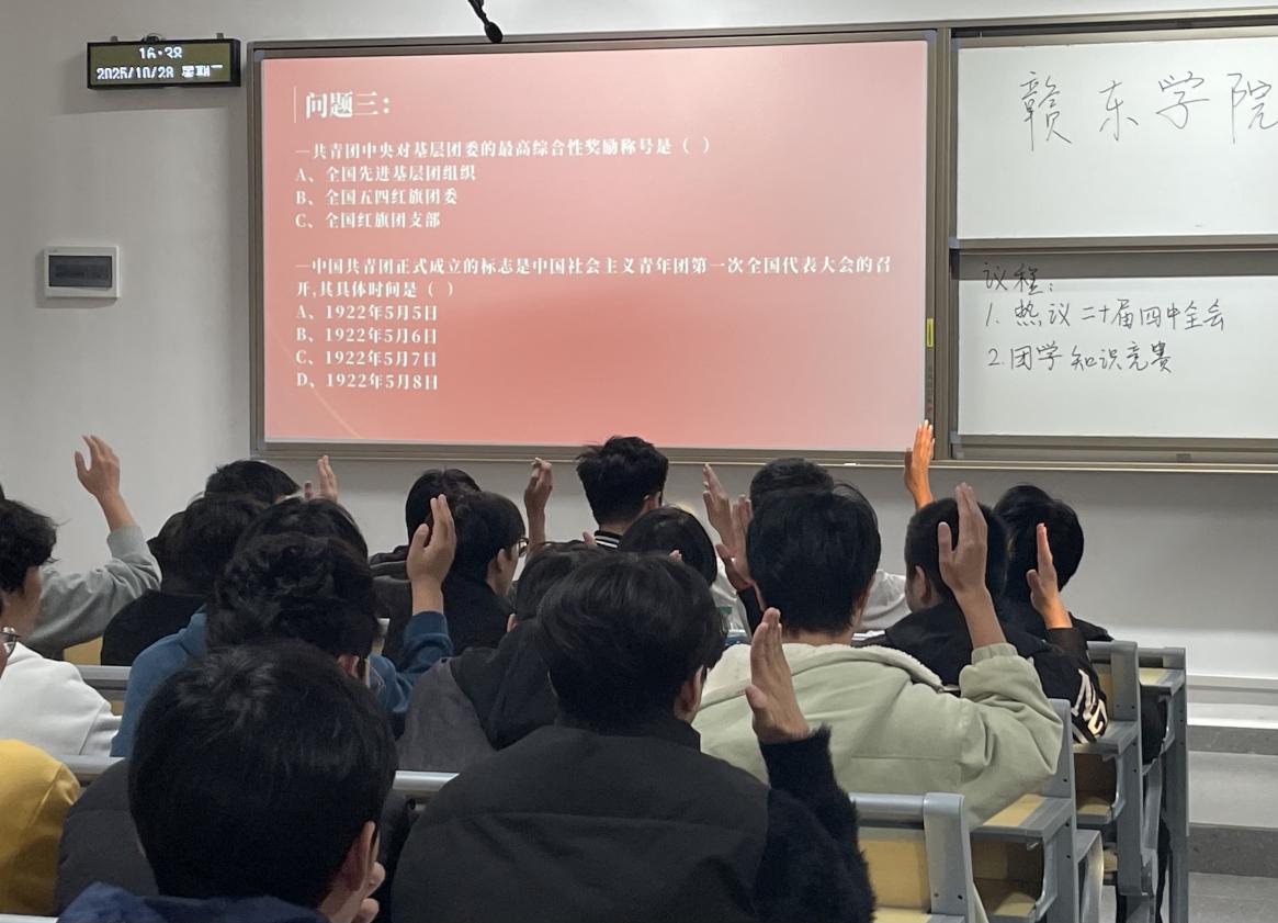 “请问‘把红旗插到福建去’的口号出自哪次历史事件?”在团知识竞答现场,随着陈昊同学的提问,选手们迅速举手抢答,激烈的角逐将活动推向高潮。本次竞答围绕党的青年运动史、团史知识、红色校史等内容设置必答、抢答、风险题三大环节,题目涵盖东征誓师、大湖坪整编等承梦班曾实地研学的红色历史场景。承梦班以初心为指引,将竞答与前期红色教育实践相结合,通过“以赛促学、以学促知”的方式,提升大家的团学知识。
