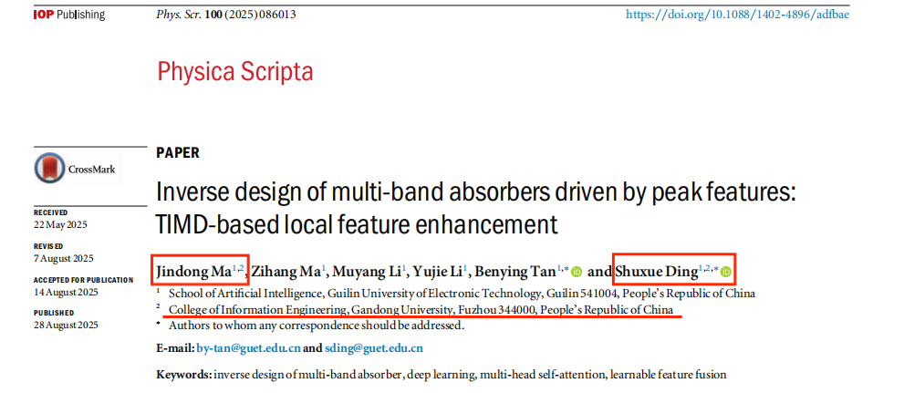 在“人工智能驱动科学发现”的交叉研究方向,团队新引进教师马劲东与丁数学教授等人合作的论文《Inverse Design of Multiband Absorbers Driven by Peak Features: TIMD-Based Local Feature Enhancement》在《Physica Scripta》期刊正式发表。该研究通过引入目标独立映射差值策略,实现了多波段吸收体结构的智能化逆向设计,为功能材料的研发提供了创新思路。