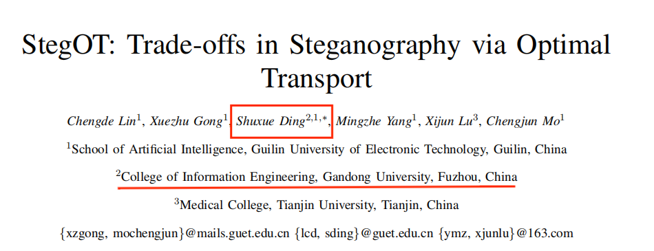 此外,团队在信息安全领域的基础应用研究也获得国际认可。林成德等人与丁数学教授合作的论文《StegOT: Trade-offs in Steganography via Optimal Transport》被多媒体领域国际顶会IEEE ICME 2025录用。该研究基于最优传输理论,系统揭示了隐写术中多项核心性能指标之间的内在权衡关系。