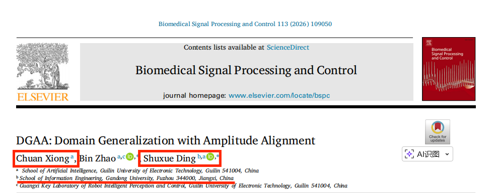 熊川老师与丁数学教授合作的另一项延续性研究成果《DGAA: Domain Generalization with Amplitude Alignment》已在线发表于中科院二区期刊《Biomedical Signal Processing and Control》。该工作聚焦跨领域数据分布协调问题,所提出的幅值对齐框架在生物医学信号处理等应用中展现出良好的潜力。
