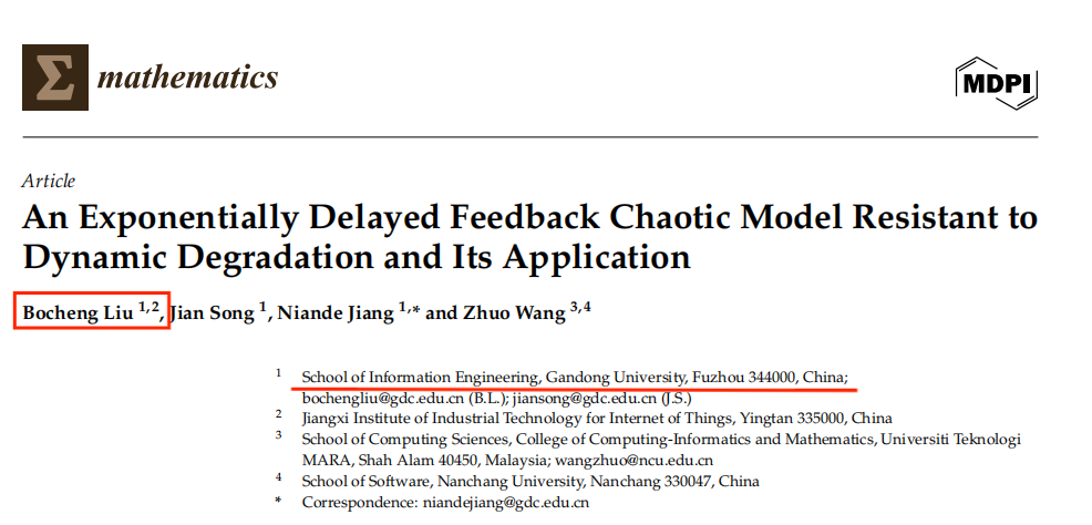 在信息安全方向,刘伯成老师团队的论文《An Exponentially Delayed Feedback Chaotic Model Resistant to Dynamic Degradation and Its Application》发表于《Mathematics》。该研究针对数字化混沌系统存在的动态退化问题,构建了具有指数延迟反馈特性的新型混沌模型,显著提升了生成序列的安全性。相关研究得到了江西省重点研发计划等项目的支持。