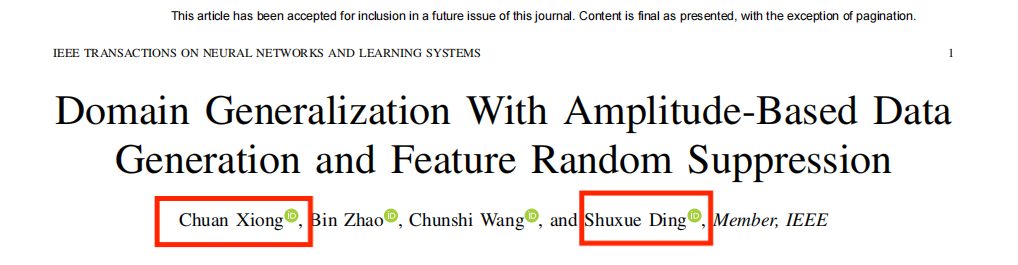 由丁数学教授带领的人工智能科研团队在多个关键研究方向取得重要进展。在提升模型泛化能力方面,团队新引进教师熊川与丁数学教授等人合作完成的论文《Domain Generalization with Amplitude-based Data Generation and Feature Random Suppression》在人工智能领域顶级期刊《IEEE Transactions on Neural Networks and Learning Systems》发表。该研究创新性地提出了结合幅值操作与特征抑制的泛化新方法,为复杂现实场景中的人工智能系统应用提供了有力的理论支持。