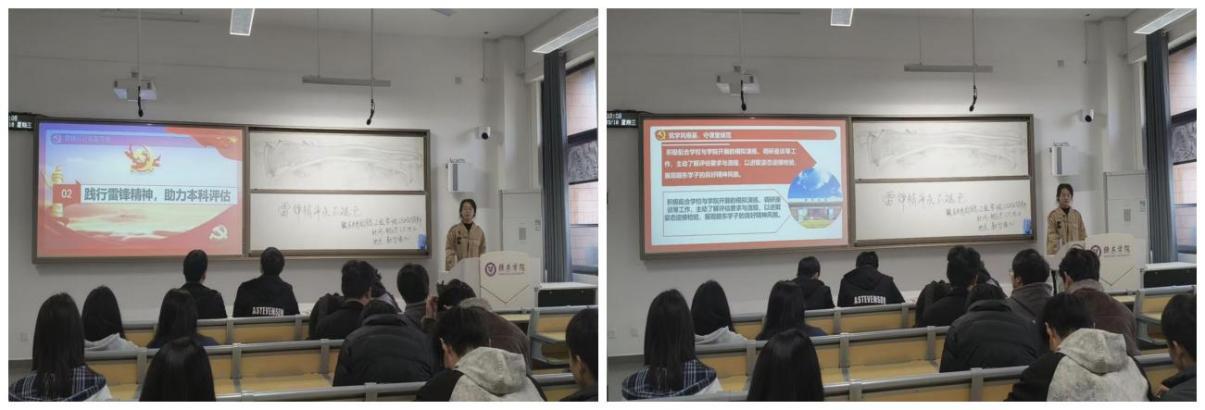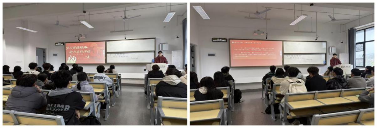 活动以理论学习为核心,组织团员重温雷锋生平事迹,解读“奉献、友爱、互助、进步”精神的时代价值,结合本科评估要求明确雷锋精神在学风建设、校园文明建设中的具体体现,凝聚“实干践行精神、担当助力评估”的思想共识。